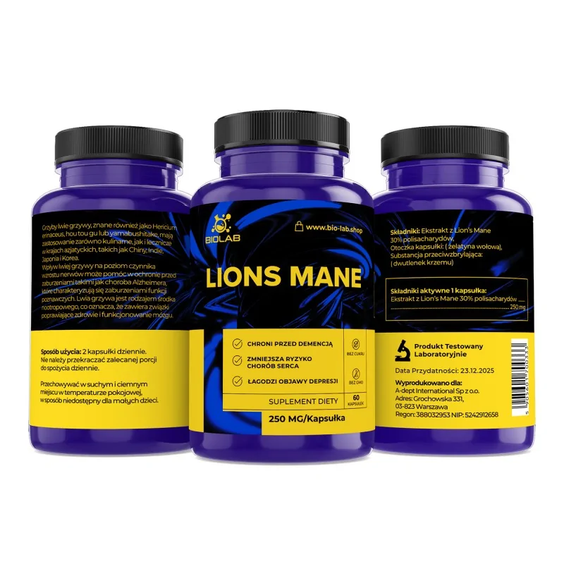 Skład: ekstrakt Lion's Mane 30% polisacharydy 250mg, otoczka żelatynowa, ditlenek krzemu
