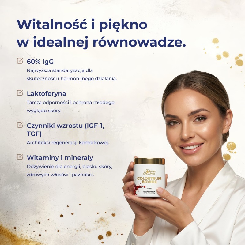 w pełni uwalnia moc natury, oferując wszystko, co najlepsze dla Twojej urody i zdrowia. Nazywane "płynnym złotem" colostrum to niezwykle cenny surowiec, będący pierwszym pokarmem dla nowonarodzonych zwierząt. Nasz suplement, wzbogacony w wysoką koncentrację immunoglobulin, został stworzony z myślą o wymagających kobietach, które pragną cieszyć się zdrowiem i pięknem
